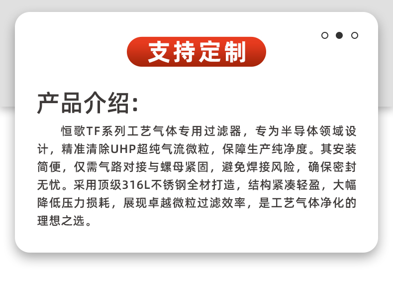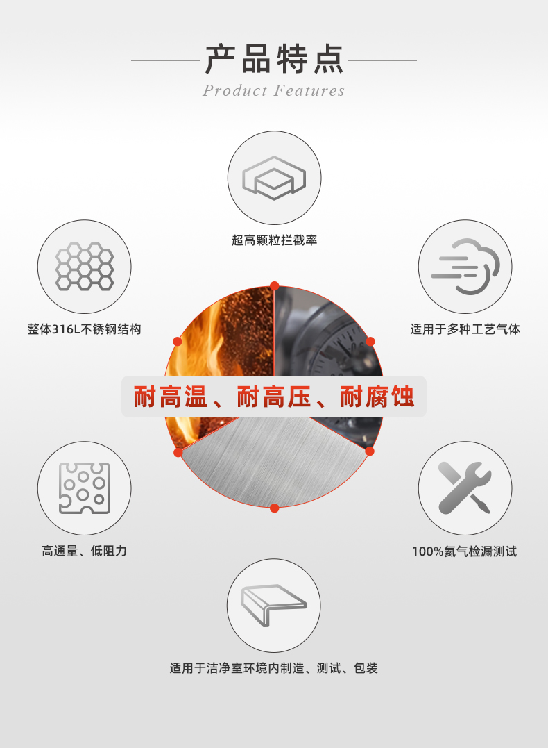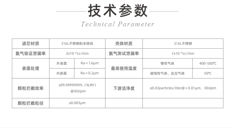 采用顶级316L不锈钢全材打造,结构紧凑轻盈,大幅降低压力损耗,展现卓越微粒过滤效率,是工艺气体净化的理想之选。